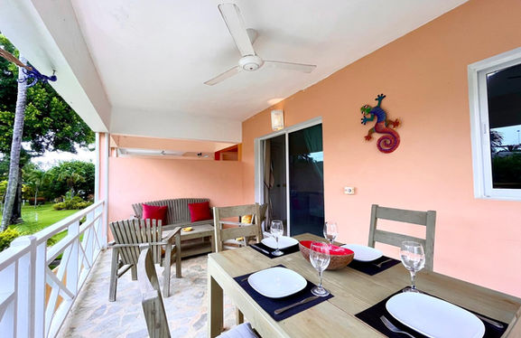 L'intérieur se compose d'une grande pièce à vivre très lumineuse avec un bel espace salon et une cuisine ouverte équipée d'un bar. La partie nuit offre deux chambres climatisées, chacune disposant de sa propre salle de bain complète privative. Un grand cabinet de toilette séparé abrite la machine à laver et offre un espace de stockage supplémentaire sécurisé, un atout majeur pour la location. Une belle terrasse couverte, équipée d'un espace repas et d'un salon, donne directement sur le parc tropical luxuriant. Pour un confort thermique optimal, des ventilateurs sont installés dans toutes les pièces de vie, les chambres, la cuisine ainsi que sur la terrasse. Ce bien clé en main combine parfaitement confort moderne, sécurité et emplacement privilégié dans l'un des secteurs les plus recherchés de Las Terrenas.